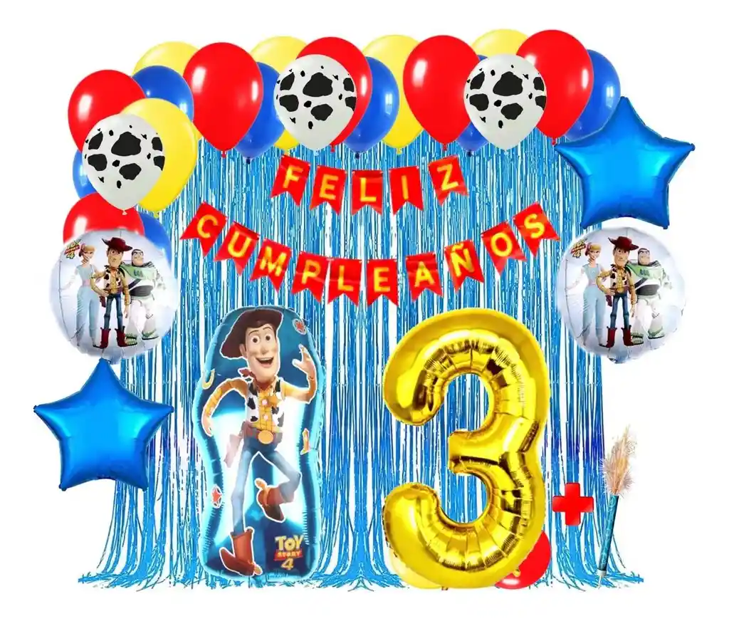 *********************GLOBOS Y PELUCHES MASMELO********************* Somos Mercado Lider Platinum Por tu compra te llevas: 1 Globo Woody 65x45cm 1 Globo número dorado 82 cm de altura según tu elección 1 Feston rojo 2 metros de largo 3 Globo vaca manchas 30cm 2 Globo estrella azul 45x45cm 2 Globo circular 45x45cm 1 Vela volcan 12 Globo amarillo 30cm 12 Globo azul 30cm 12 Globo rojo 30cm 2 Cortina flecos azul 2x1 metros 1 Cinta de Arco 5 metros 1 Instructivo de armado de kit