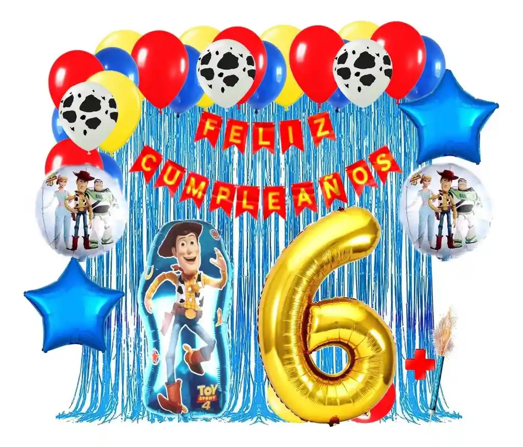 *********************GLOBOS Y PELUCHES MASMELO********************* Somos Mercado Lider Platinum Por tu compra te llevas: 1 Globo Woody 65x45cm 1 Globo número dorado 82 cm de altura según tu elección 1 Feston rojo 2 metros de largo 3 Globo vaca manchas 30cm 2 Globo estrella azul 45x45cm 2 Globo circular 45x45cm 1 Vela volcan 12 Globo amarillo 30cm 12 Globo azul 30cm 12 Globo rojo 30cm 2 Cortina flecos azul 2x1 metros 1 Cinta de Arco 5 metros 1 Instructivo de armado de kit