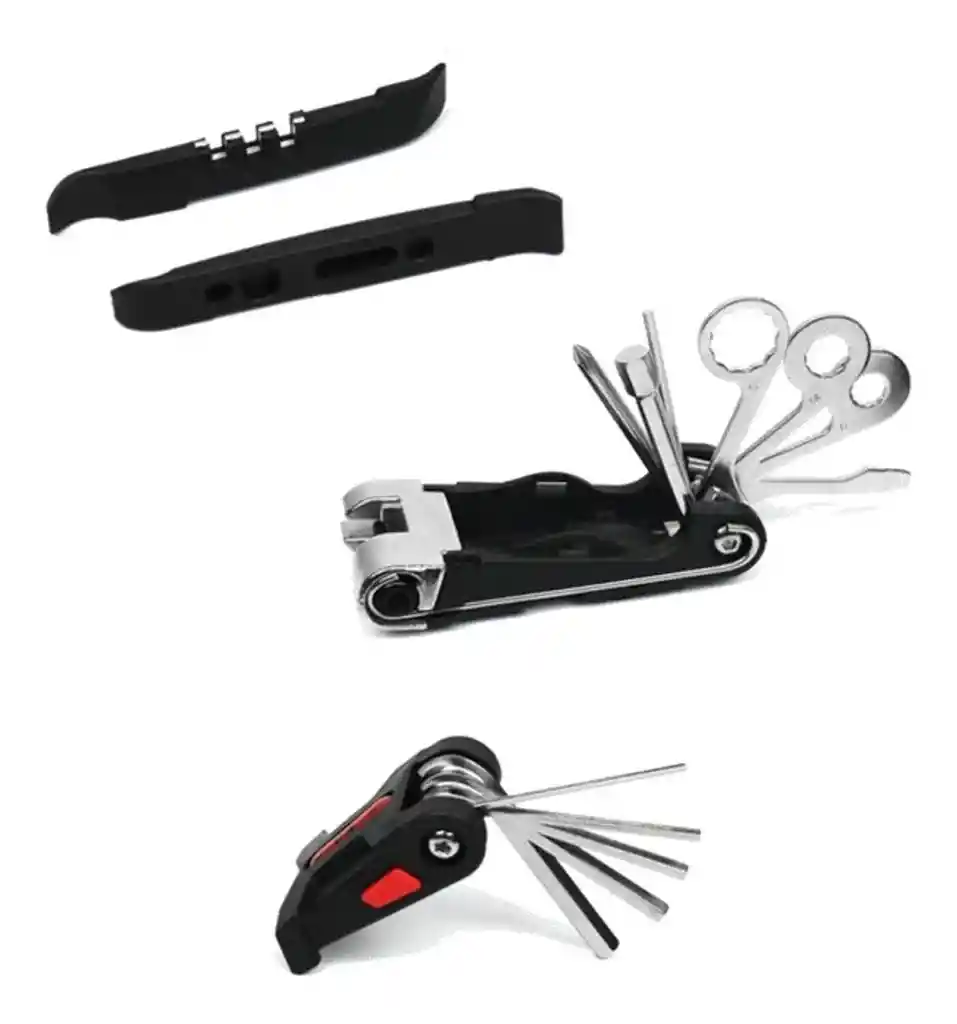 Llave tipo navaja - 19 funcionesBristol. Allen o Hexagonal 2mm. 2.5 . 3 mm. 4 mm. 5 mm. 6 mm y 8 mm.DestornilladorExtractor de CadenaLlave de anillos 12/14/15Llave de Radios: 12/14/15 gPalancas para neumático1 Gancho