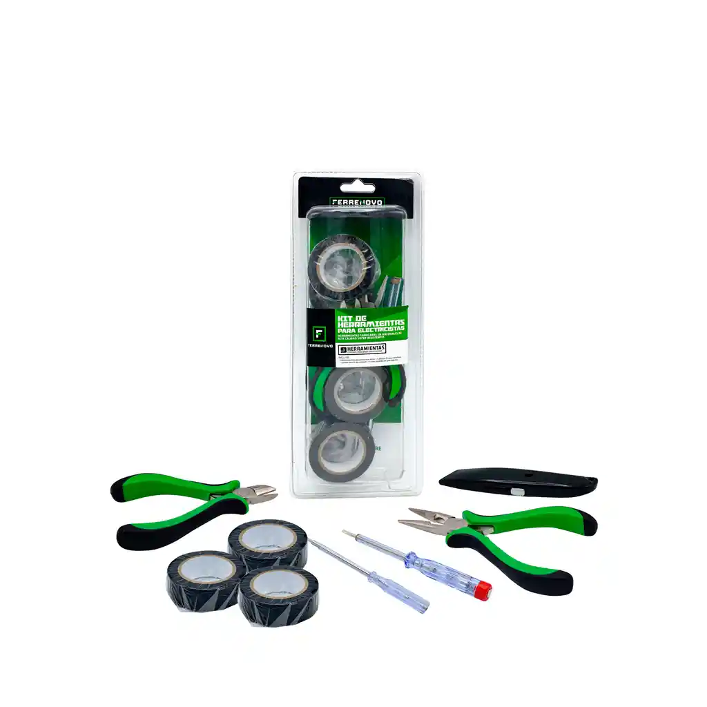Kit de herramientas especiales para electricistas, 9 piezas especiales para trabajar en tareas de electricidad, herramientas fabricadas en materiales de alta calidad que las hacen resistentes. • Kit de herramientas especiales para electricistas. • 9 piezas especiales para trabajar en tareas de electricidad. • Incluye herramientas manuales como: - 2 destornilladores pequeños tipo tester. - 2 alicates (Pinza y cortafríos) con mango aislante. - 1 cuchilla retráctil de precisión - 4 cintas aislantes de gran sujeción. • Herramientas fabricadas en materiales de alta calidad que las hacen resistentes