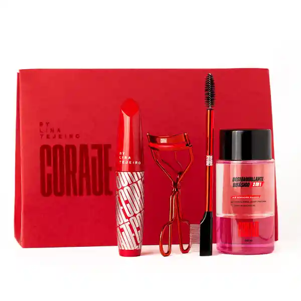 El Kit "Imparable Coraje" se presenta en un empaque exclusivo y moderno, diseñado para resaltar el espíritu audaz y empoderado de la marca. Incluye herramientas y productos esenciales para lograr una mirada impactante y cuidada. Contiene un Rímel Coraje, un encrespador de Pestañas Rojo Audaz, un separador Rojo Audaz y un desmaquillante Bifásico 2 en 1 y la caja del kit.
