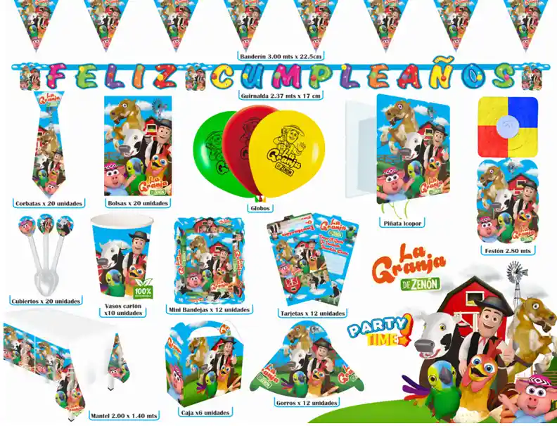 COMBO FIESTERO LA GRANJA DE ZENON VASO *12 BANDEJA PARA TORTA *12 CUBIERTO *20 MANTEL *1 GUIRNALDA FELI CUMPLEAÑOS *1 BOMBA R12*12