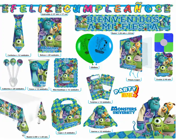 COMBO FIESTERO monsters university VASO *12 BANDEJA PARA TORTA *12 CUBIERTO *20 MANTEL *1 GUIRNALDA FELIZ CUMPLEAÑOS *1 BOMBA R12*12