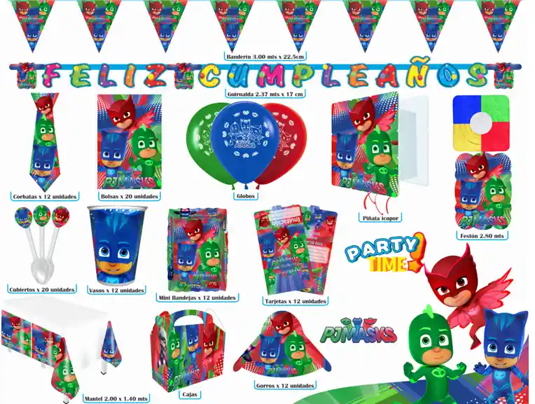 COMBO FIESTERO PJMASKS VASO *12 BANDEJA PARA TORTA *12 CUBIERTO *20 MANTEL *1 GUIRNALDA FELI CUMPLEAÑOS *1 BOMBA R12*12