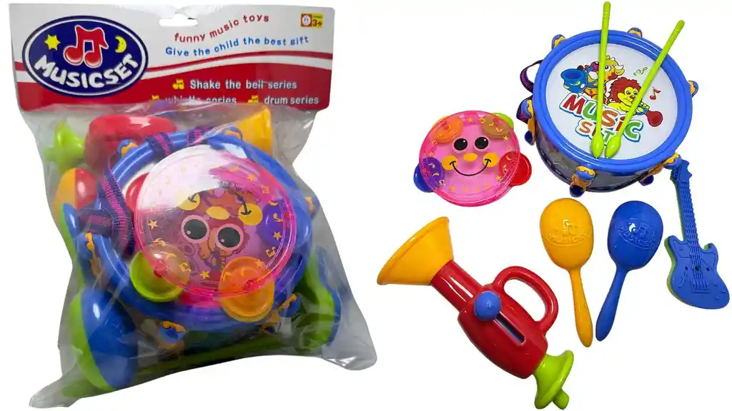 KIT DE INSTRUMENTOS MUSICALES DE JUGUETE PARA NIÑOS REF: 2012D Dale ritmo y diversión a los días de juego con este completo Kit de Instrumentos Musicales de Juguete. Diseñado especialmente para los pequeños artistas que aman la música, este set incluye una batería con baquetas, dos maracas, una pandereta, una trompeta y una guitarra de juguete. Ideal para estimular la coordinación, la creatividad y el gusto por el arte musical desde temprana edad. Con colores llamativos y diseño seguro, este kit promueve el desarrollo sensorial y la motricidad fina, mientras los niños disfrutan creando sus propias melodías y descubren el mundo del ritmo y el sonido. CARACTERÍSTICAS: Incluye: batería con baquetas, 2 maracas, pandereta, trompeta y guitarra. Colores vivos y atractivos. Material resistente y seguro para niños. Condición del producto: Nuevo. ¿QUÉ INCLUYE TU PRODUCTO? Kit de instrumentos musicales de juguete con varios instrumentos: batería, baquetas, maracas, pandereta, trompeta y guitarra. Ideal para fomentar el aprendizaje y la creatividad a través de la música. Juguete educativo y recreativo Despierta la imaginación, el oído musical y las habilidades motoras. El mejor regalo para niños y niñas amantes de la música. ZZZZZZZZZZZZZZZZZZZZZZZZZZZZZZZZZZZZZZZZZZZZZZZZZZZZZZZZZZZZZZZZZZZZZZ MÁS DETALLES: Condición: Nuevo MÁS INFORMACIÓN DE NOSOTROS Somos INVERSIONES MAZUGI. Importadores directos desde China. Cumplimos con distribuir a todo el país. Estamos ubicados en Bogotá, somos tienda virtual y física. PRODUCTOS AL POR MAYOR Y DETALLE. Somos una empresa importadora y comercializadora de productos de Alta Calidad en varias categorías como: belleza, tecnología, hogar, juguetería, cuidado personal, entre otras.