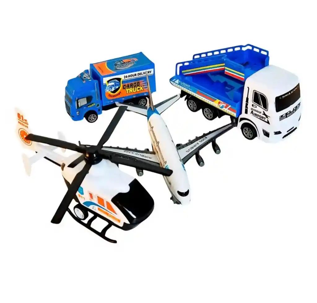 Kit de Juguetes “Simulation Car Model” – Aeropuerto y Rescate | Set Completo Este set de vehículos es perfecto para niños que aman los aviones, los helicópteros y los camiones de trabajo. El kit incluye varios modelos diseñados para recrear escenas de aeropuerto, transporte y rescate, fomentando la imaginación y el juego de roles. Incluye: ✈️ Avión tipo Airbus A399 🚁 Helicóptero de rescate/policía 911 🚚 Camión de carga “Cargo Truck – 24 Hour Delivery” 🛻 Camión con escaleras de aeropuerto (Flight Boarding) Características principales: ✅ Modelos de simulación con diseño detallado ✅ Función pull-back en los vehículos para mayor diversión ✅ Ideal para crear escenarios completos de aeropuerto, rescate y transporte ✅ Material resistente, seguro y apto para niños desde los 3 años ✅ Tamaño compacto y fácil de manipular por los más pequeños Un juguete versátil y educativo que brinda horas de entretenimiento. Perfecto para regalo, colección o juego diario