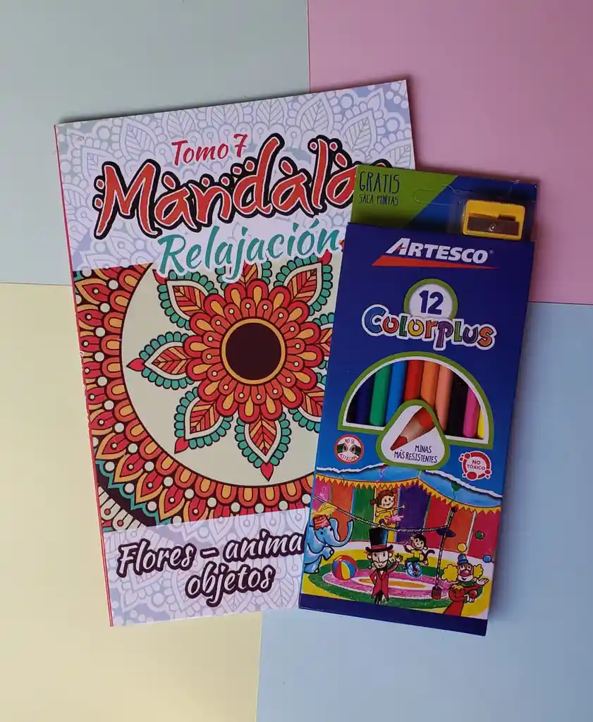 Disfruta de todos los beneficios de colorear mándalas con el kit de libro para colorear mándalas de 96 páginas + colores + sacapuntas.