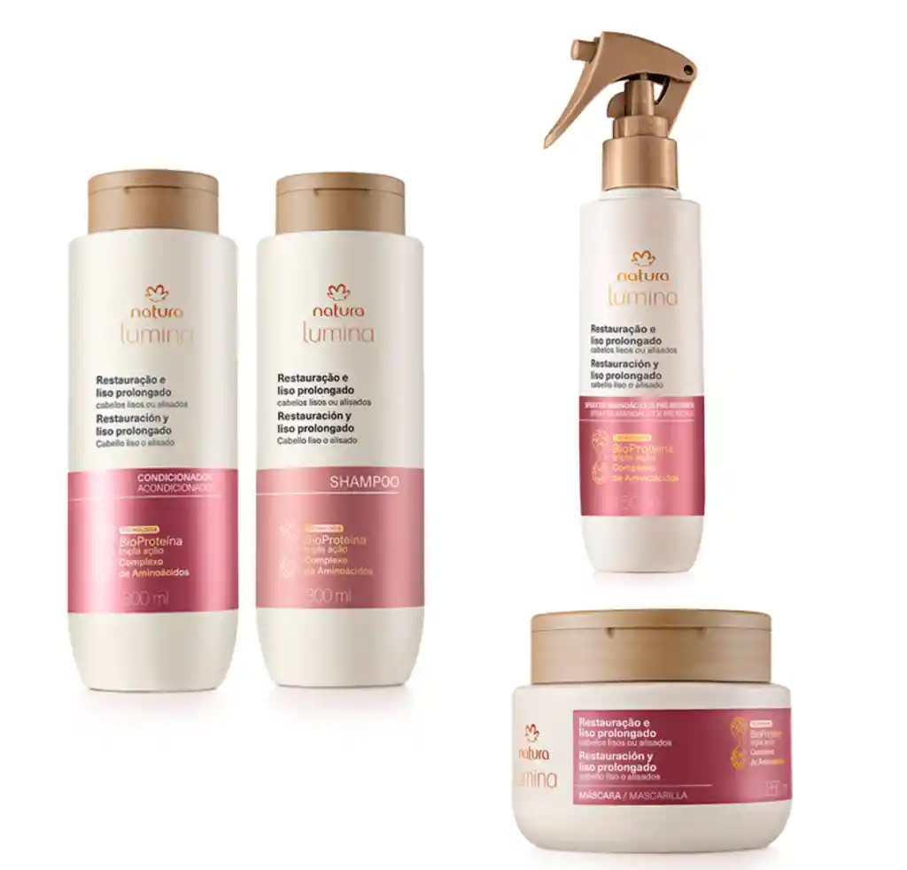 Kit liso y alisado completo El kit contiene: - 1 Shampoo restauración 300 ml - 1 Acondicionador 300 ml - 1 Mascarilla acondicionadora 250 ml - 1 Spray de aminoácidos pre secado 150 ml Las imágenes son ilustrativas. Algunos productos están en posición frontal. El contenido de cada producto es el indicado en su descripción.