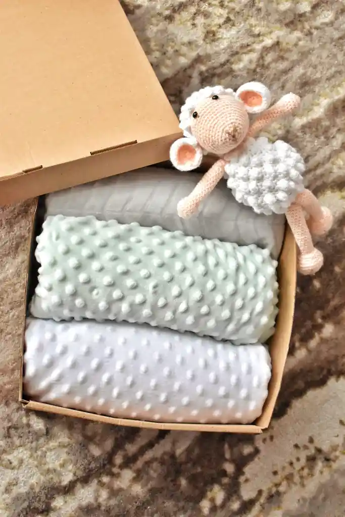 KIT PARA BIENVENIDA RECIEN NACIDO, esta compuesto por: 2 Mantas de 100X90 cm y un muñeco tejido (segun disponibilidad)