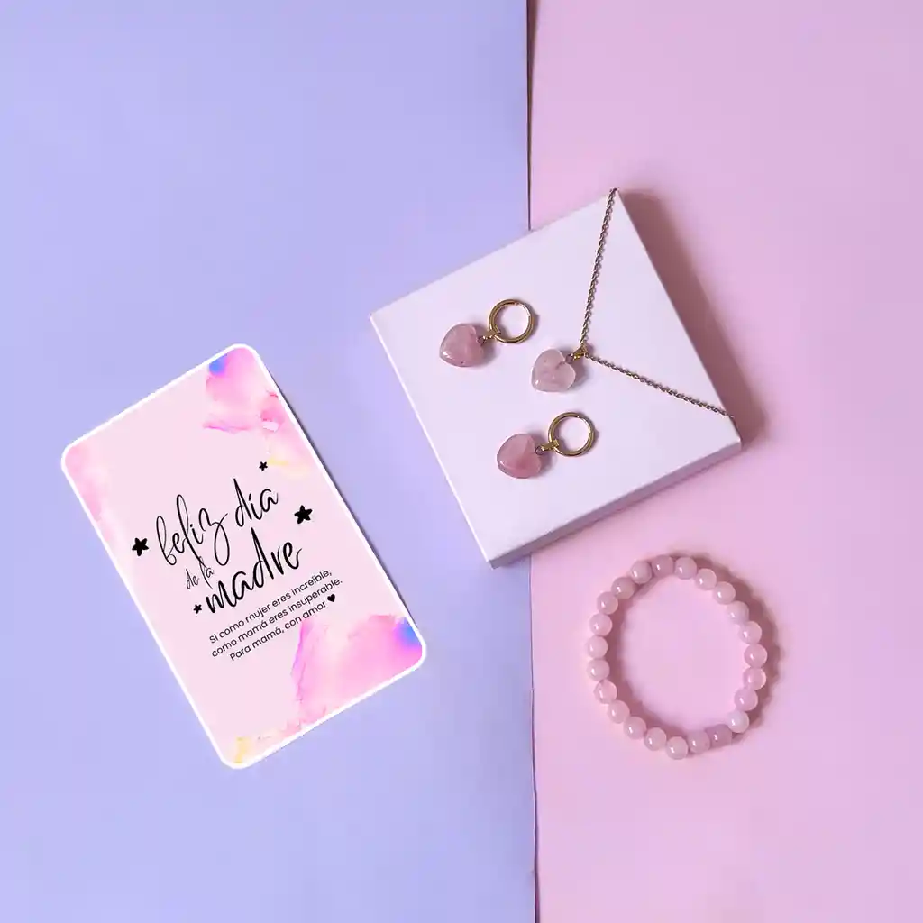 Este kit incluye: ✦ 1 Collar en Cuarzo Corazón Rosa ✦ 1 Par de Candongas en Cuarzo Corazón Rosa ✦ 1 Brazalete en Cuarzo Rosa
