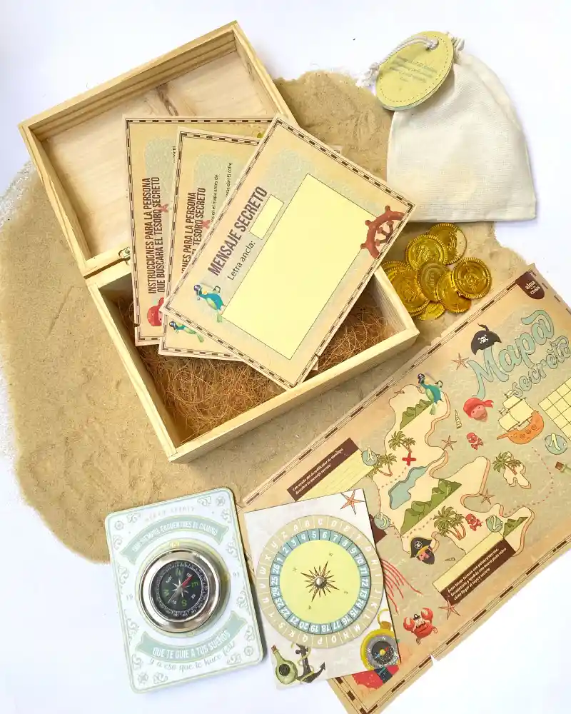 ¿Una nueva aventura/regalo inolvidable de principio a fin? Con este kit de mapa del tesoro secreto esa nueva sorpresa será toda una aventura! Una nueva aventura/regalo inolvidable de principio a fin? Con este kit de mapa del tesoro secreto esa nueva sorpresa será toda una aventura! El kit incluye: Instrucciones para la persona que entregará el regalo Instrucciones para la persona que recibe el regalo Tarjeta para mensaje secreto. Brújula sobre base rígida con mensaje Decodificador de mensaje sobre base rígida Bolsa de tela con 10 monedas de oro en plástico. Cofre en madera/pino. Personaliza tu kit con un mensaje personal.