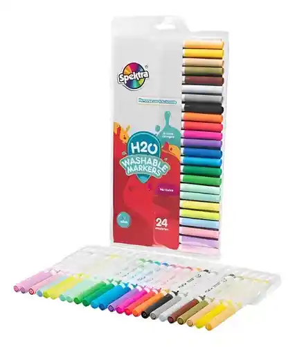 Empaque de regalo sin costo adicional, escríbenos al finalizar la compra. 3 años + Explora el mundo del color con este set de 24 marcadores lavables H2O de Spektra. Perfectos para niños y adultos, ofrecen colores vibrantes y trazos suaves ideales para dibujos, manualidades y proyectos escolares. Su fórmula lavable garantiza una limpieza fácil, haciendo que sean seguros y prácticos para el uso diario. Diseñados con puntas resistentes, permiten un control preciso y una experiencia creativa sin límites. Empacados en un estuche práctico, estos marcadores son ideales para llevar a cualquier lugar. ¡Da rienda suelta a tu imaginación y disfruta de la mejor herramienta para tus proyectos artísticos!