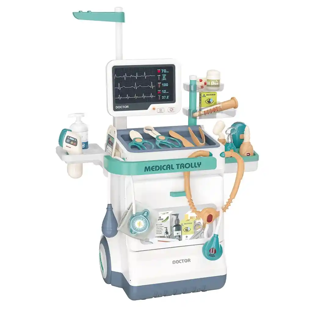 Convierte a tu amado bebé en un pequeño médico: utiliza la rica imaginación y creatividad de los niños para experimentar la diversión de ser médico. Carrito médico multiusos: los niños pueden hacer "chequeos médicos" para miembros de la familia o amigos a través de un carrito médico con ruedas. Contador de almacenamiento y taquilla de gran tamaño para todos los accesorios. Cultivar a los niños para que desarrollen buenos hábitos de almacenamiento durante el juego, pero también pueden aprender conocimientos médicos y de salud. Una diversión completa de herramientas médicas: el kit de carrito médico viene con una jeringa, estomatoscopio, termómetro, gráfico ocular, rayos X y mucho más. El estetoscopio mejorado produce un auténtico sonido de latido del corazón y un efecto de luz real. Varilla de medición telescópica gratuita en cualquier momento para registrar la altura del niño. Certificado y seguro: puedes estar seguro de usar un traje médico que sea seguro y divertido. Hecho de material ABS de alta calidad, sin BPA, sin olor, superficie lisa.