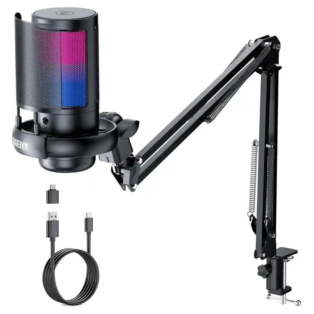 Luces sinfónicas RGB degradadas: Luces RGB cíclicas y degradadas, acordes con la estética de su transmisión en vivo. Te ofrece una experiencia de juego inmersiva y despierta todos tus sentidos. También hay una sensación palpable de seguridad, y cuando el micrófono BBEIYY está silenciado, las luces RGB se apagan para avisarte que estás trabajando. Evite accidentes cuando olvide silenciar el micrófono de su PC para jugar. Función práctica y conveniente: está equipado con un sensor táctil de silencio de un botón. Cuando quieras cerrar el Microfono, solo necesitas tocarlo ligeramente para silenciar el sonido, y la luz RGB se apagará para informarte que el Microfono se ha cerrado exitosamente. Equipado con un botón de control giratorio de volumen en la parte inferior. Patrón polar cardioide: este micrófono presenta un patrón polar cardioide que captura un sonido nítido, suave y claro frente al micrófono, reduciendo la captación lateral para que pueda concentrarse en su voz. Al mismo tiempo, está equipado con una cápsula de diafragma de condensador ultragrande de 25 mm, que puede capturar una gama más amplia de audio con una frecuencia de muestreo de hasta 192 kHz, y la captación es delicada y sin ruido. AJUSTE SÓLIDO: Con una base pesada de acero al carbono, sus grandes movimientos no derribarán el micrófono, incluso durante sesiones de juego intensas. Se adopta la pantalla antisalpicaduras de metal desmontable. En comparación con la esponja, la pantalla metálica antisalpicaduras puede filtrar el sonido explosivo de manera más efectiva. Plug and Play: Microfono para juegos de PC para transmisión, compatible con computadoras de escritorio y portátiles PS4/PS4pro/PS5. Puedes ingresar rápidamente al chat del juego. El cable de datos USB desmontable de 250 cm de largo se puede extender desde la parte posterior del host de la computadora hasta el cuerpo principal de su micrófono USB para juegos sin limitación. Brazo flexible: el brazo metálico fácil de colocar se ajusta para admitir una variedad de configuraciones, y puedes llevar rápidamente el micrófono podcast a tu boca cuando está en uso, o plegarlo para ahorrar más espacio.