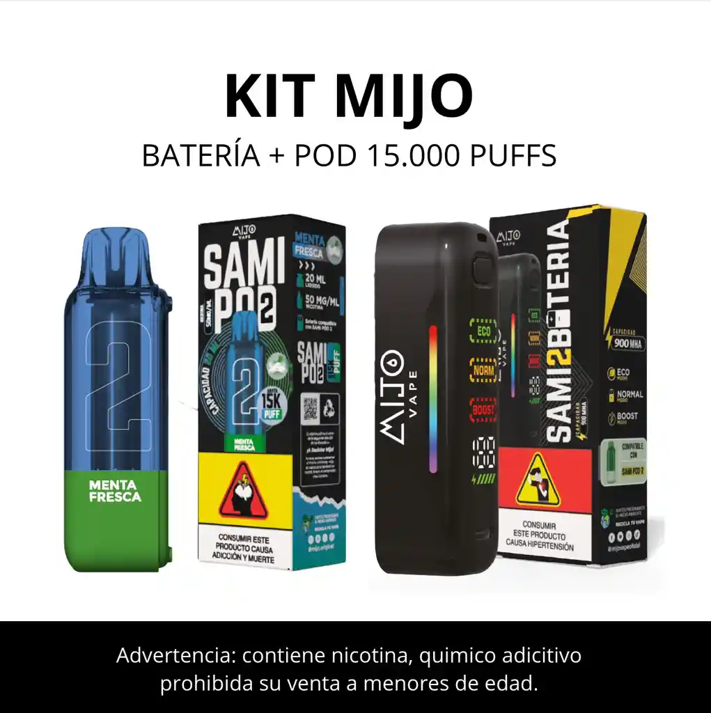 Kit completo, Bateria y Pod mijo sabor Menta Fresca 15.000 puffs 5% nicotina. Bateria reutilizable.