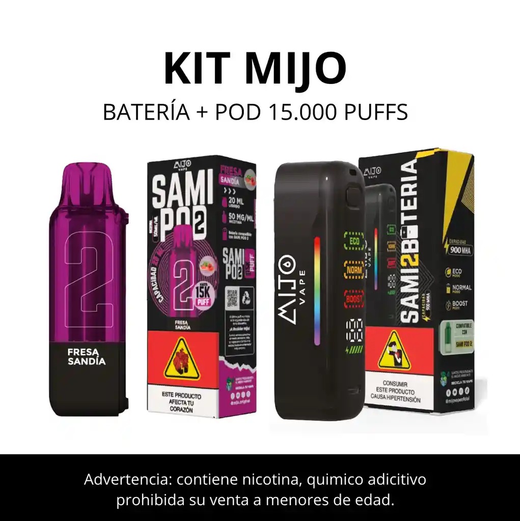 Kit completo, Bateria y Pod mijo sabor Fresa sandia 15.000 puffs 5% nicotina. Bateria reutilizable.