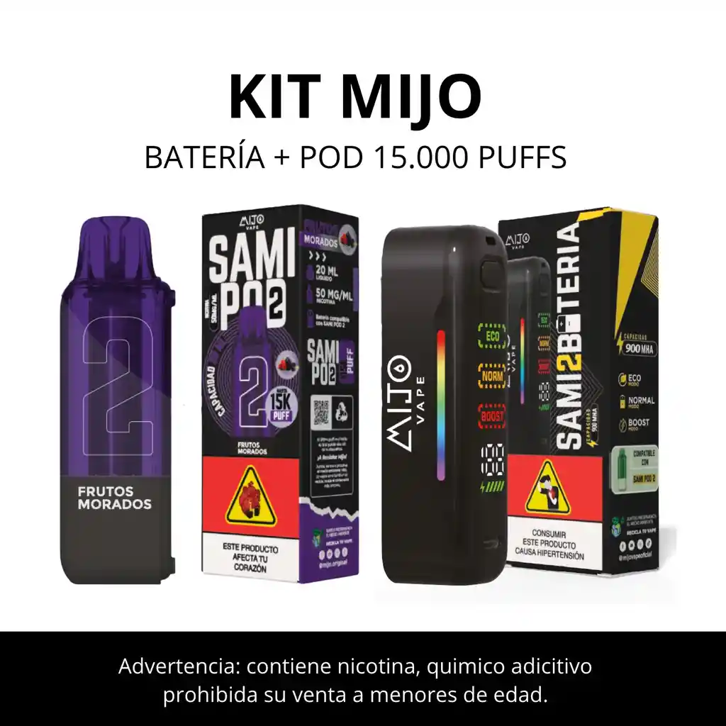 Kit completo, Bateria y Pod mijo sabor Frutos Morados 15.000 puffs 5% nicotina. Bateria reutilizable.