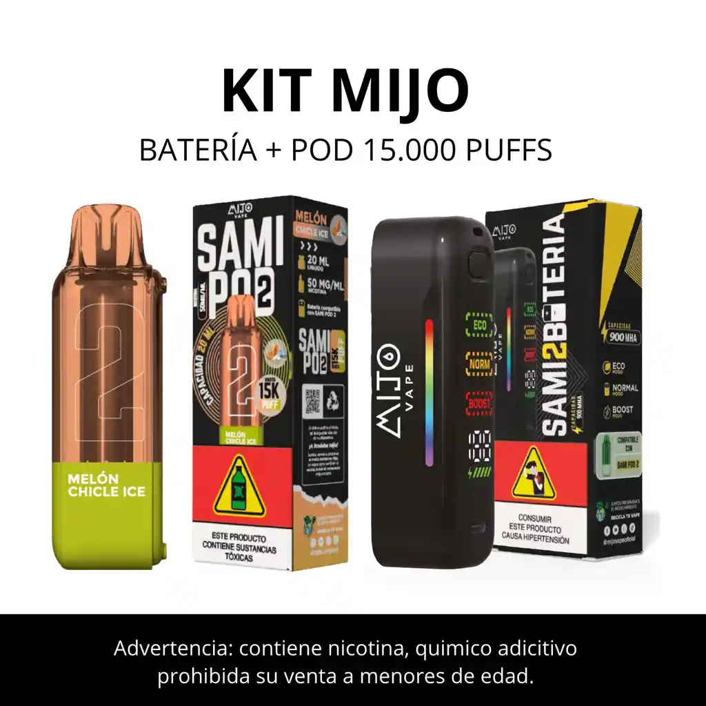 Kit completo, Bateria y Pod mijo sabor Melon Chicle 15.000 puffs 5% nicotina. Bateria reutilizable.