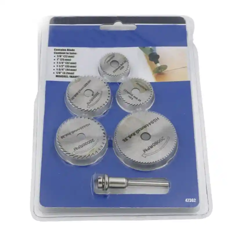 CaracterísticaS: 1. El cuerpo de acero endurecido garantiza Cortes rectos y precisos 2. La hoja de resistencia ofrece un corte más rápido y una vida extra larga para los aficionados 3. Juego de 5 mini sierra circular discos de corte para su uso en mini brocas de hobby para pequeños trabajos de corte Descripción del artículo: 1. 100% nuevo y de alta calidad 2. Tipo: hoja de sierra eléctrica 3. Material: acero de alta velocidad 4. Diámetro exterior: 22-44mm 5. Diámetro interior 6,35mm 6. Espesor: 0,8mm Función: 1. Hojas de sierra: 22mm, 25mm, 32mm, 35mm, 44mm con poste de 3,2mm 2. El juego de cuchillas y mandril de acero de alta velocidad es ideal para cortes de precisión fina en aluminio, latón, cobre, madera y plástico El paquete incluye: 1x22mm/0,8mm/6,35mm 1x25mm/0,8mm/6,35mm 1x32mm/0,8mm/6,35mm 1x35mm/0,8mm/6,35mm 1x44mm/0,8mm/6,35mm 1 mandril de 3,2mm