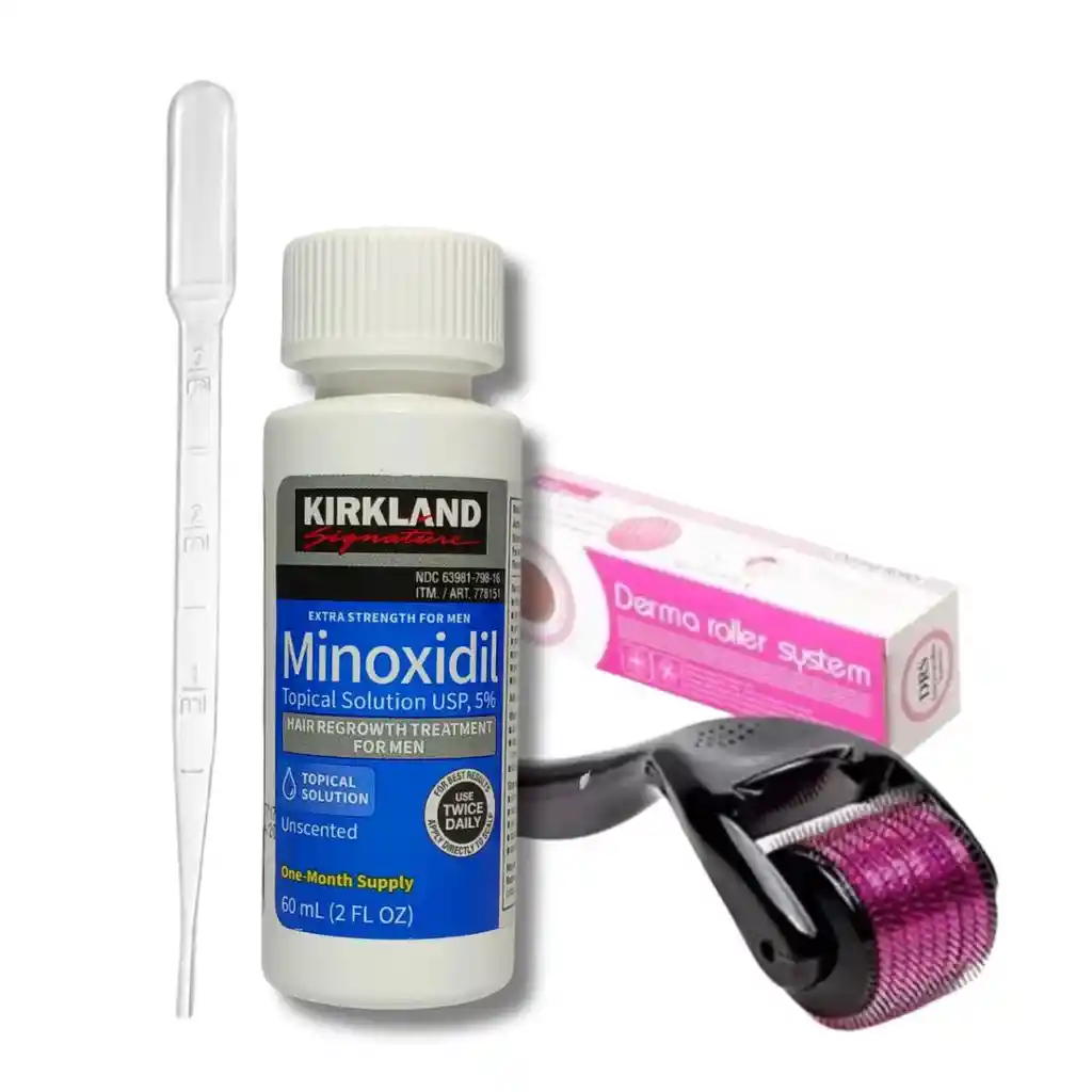 Para barba: Estimula el crecimiento en zonas con poca densidad. Para cabello: Activa folículos y fortalece la raíz para más volumen. Características principales del kit o combo Incluye frasco Minoxidil 5% 60ml + dermaroller facial. Fórmula americana con alta absorción y textura ligera. Beneficios reales y visibles Resultados desde la semana 3 con uso constante. Mayor densidad, grosor y crecimiento uniforme. Modo o rutina de uso rápido Usa el dermaroller 3 veces por semana y aplica Minoxidil dos veces al día.