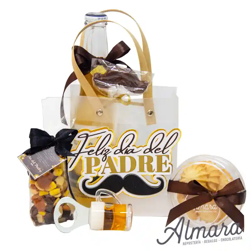 Regalos y detalles día del padre Contiene: 1 Cerveza Corona 1 Paleta de chocolate mostacho Destapador Jarra Cervecera 1 tarro de galletas Mixtura de nueces Todo presentado en una elegante bolsa de regalo con aplique decorativo de la temática