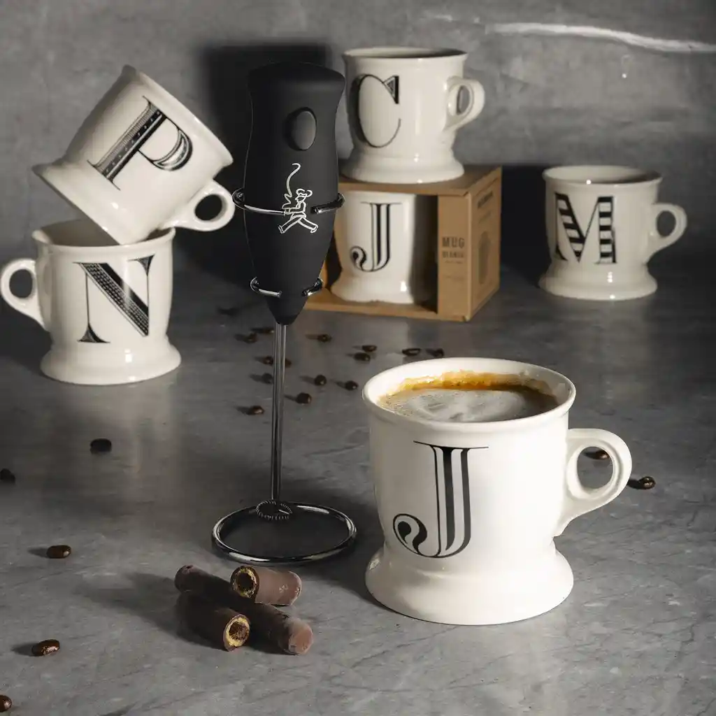 Kit especial conformado por un Mug en porcelana + Batidor de Café. Mug en porcelana blanca de estilo vintage marcado con la letra A como un monograma del nombre de quien lo porta. Su tamaño generoso lo hace ideal para café, té o chocolate caliente. Por su versatilidad se mezcla y combina fácilmente con otras vajillas. Además el Batidor de Café tiene un espumador en acero inoxidable, mango ergonómico en plástico y suave silicona y base en metal cromado. Con un solo botón se enciende y se apaga para una fácil operación. Ideal para batir y espumar la leche, para hacer capuchino, café con leche y malteadas. También se puede usar como ayudante de cocina para romper el huevo, batir adherezos, salsas o claras de huevo para los postres. Práctico para llevar de viaje y para actividades al aire libre. Importador: Distribuidora Matec S.A.S