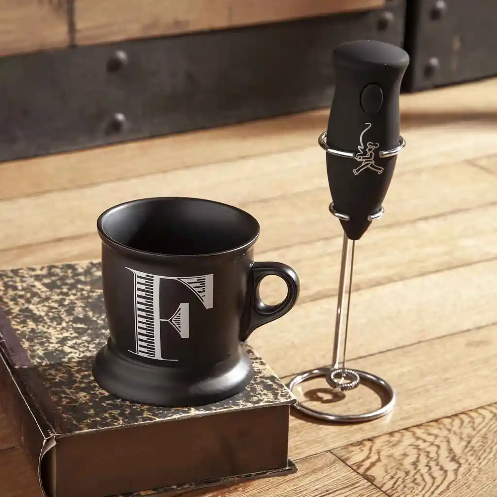 Kit especial conformado por un Mug en porcelana negro + Batidor de Café. Mug en porcelana blanca de estilo vintage marcado con la letra A como un monograma del nombre de quien lo porta. Su tamaño generoso lo hace ideal para café, té o chocolate caliente. Por su versatilidad se mezcla y combina fácilmente con otras vajillas. Además el Batidor de Café tiene un espumador en acero inoxidable, mango ergonómico en plástico y suave silicona y base en metal cromado. Con un solo botón se enciende y se apaga para una fácil operación. Ideal para batir y espumar la leche, para hacer capuchino, café con leche y malteadas. También se puede usar como ayudante de cocina para romper el huevo, batir adherezos, salsas o claras de huevo para los postres. Práctico para llevar de viaje y para actividades al aire libre. Importador: Distribuidora Matec S.A.S