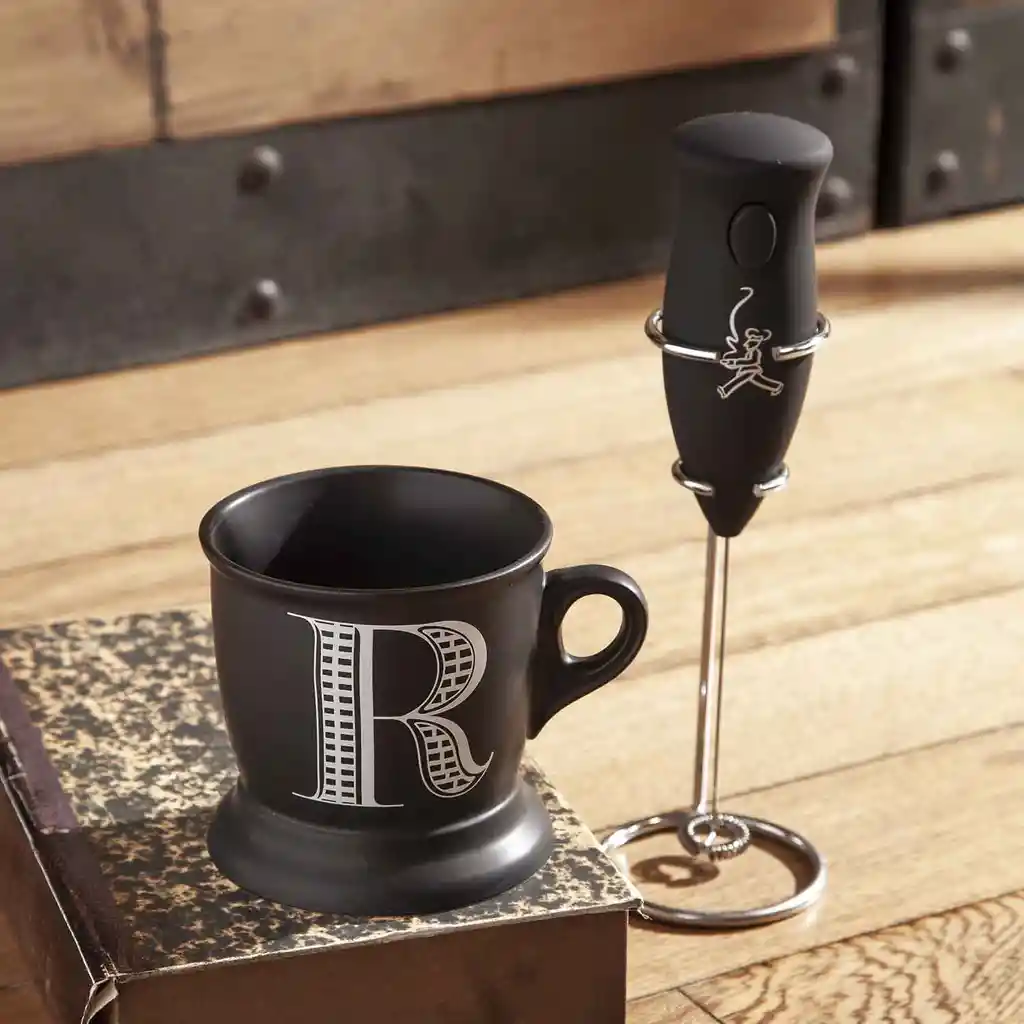 Kit especial conformado por un Mug en porcelana negro + Batidor de Café. Mug en porcelana blanca de estilo vintage marcado con la letra A como un monograma del nombre de quien lo porta. Su tamaño generoso lo hace ideal para café, té o chocolate caliente. Por su versatilidad se mezcla y combina fácilmente con otras vajillas. Además el Batidor de Café tiene un espumador en acero inoxidable, mango ergonómico en plástico y suave silicona y base en metal cromado. Con un solo botón se enciende y se apaga para una fácil operación. Ideal para batir y espumar la leche, para hacer capuchino, café con leche y malteadas. También se puede usar como ayudante de cocina para romper el huevo, batir adherezos, salsas o claras de huevo para los postres. Práctico para llevar de viaje y para actividades al aire libre. Importador: Distribuidora Matec S.A.S