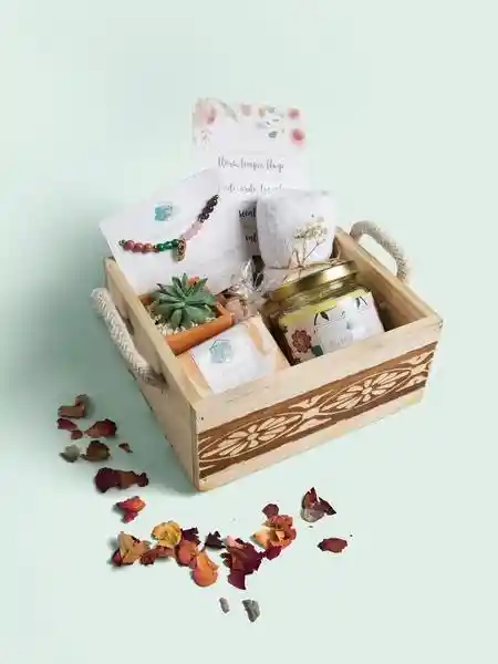 Vela aromática jabón de glicerina bomba efervescente manilla hooponopono suculenta y toalla facial. Caja madera