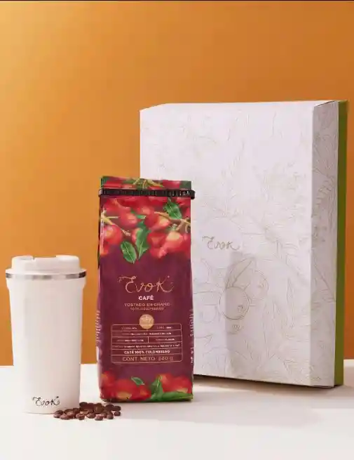 Set con vaso térmico perla 450 ml y café en grano Evok 340 g. Conserva la temperatura y ofrece aroma equilibrado. Incluye caja de regalo.