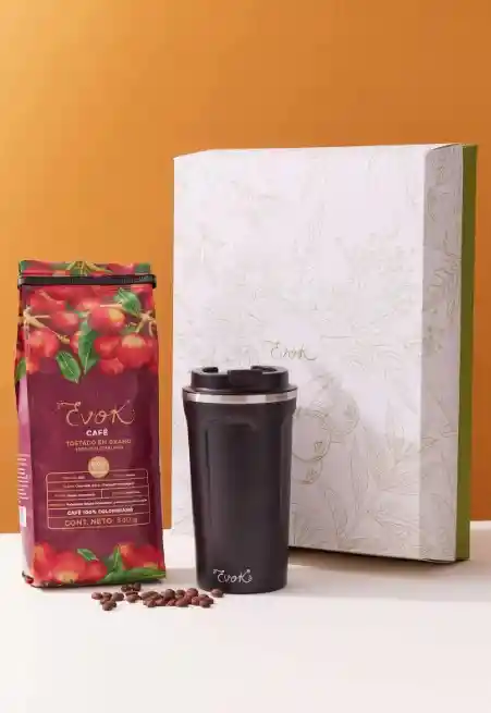 Set con vaso térmico negro 450 ml y café en grano Evok 340 g. Conserva la temperatura y ofrece un sabor equilibrado. Incluye caja de regalo.