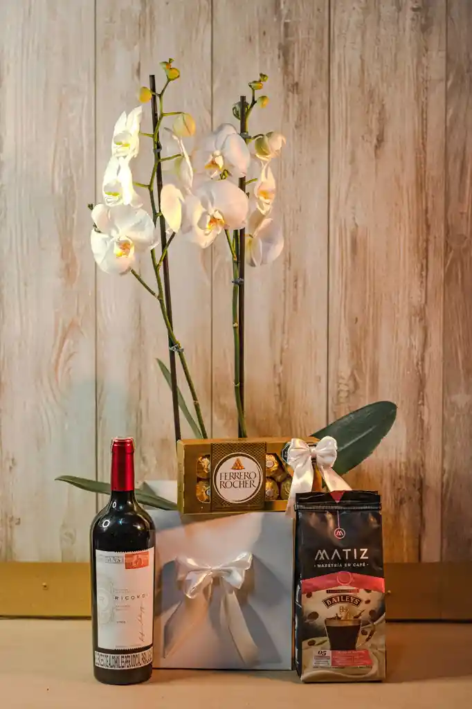 Orquidea en matera de cerámica, con Chocolates Ferrero Rocher x 8 unidades, botella de vino 750 Mls (Gato negro o Ricordi) y Café 250 grms (Juan Valdez o café Matiz edición Baileys) en caja de decorativa y tarjeta dedicatoria