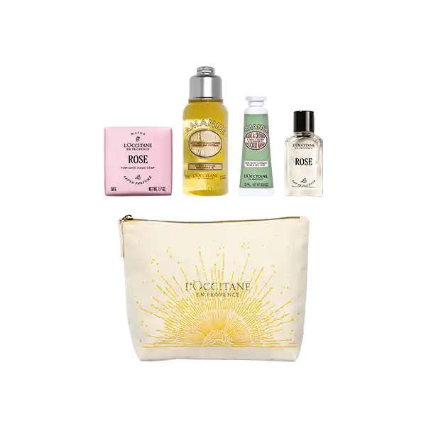 Este Kit contiene: Jabón Sólido Rose (Antes Rosa) 50g, Aceite de Ducha Almendras 75ml, Crema para Manos Almendras 10ml, Perfume Rose (Antes Rosa) Eau de Toilette 7,5ml, Bolsito Luz Beige.