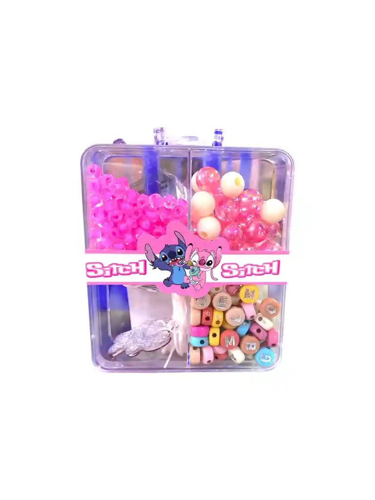 Set creativo de mostacillas inspirado en personajes, ideal para hacer pulseras, collares o llaveros personalizados. Incluye cuentas de colores, letras, cordones elásticos y compartimentos organizados para facilitar su uso. Perfecto para niños, adolescentes o cualquier fan de las manualidades y del tierno personaje de Disney.
