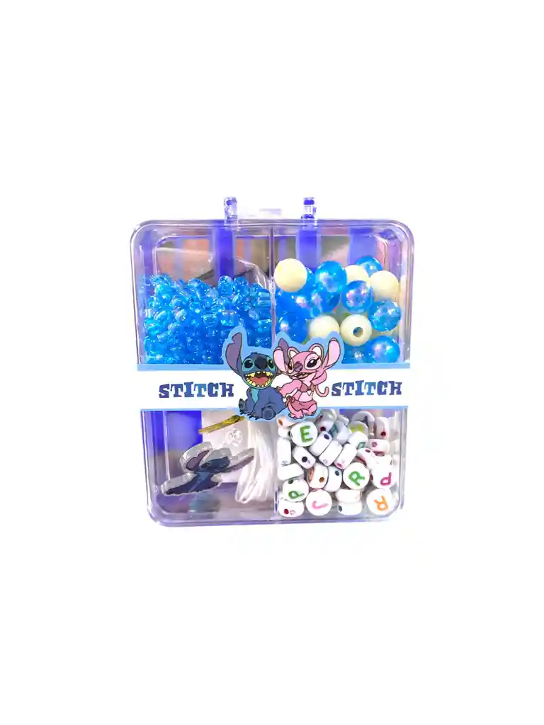 Set creativo de mostacillas inspirado en personajes, ideal para hacer pulseras, collares o llaveros personalizados. Incluye cuentas de colores, letras, cordones elásticos y compartimentos organizados para facilitar su uso. Perfecto para niños, adolescentes o cualquier fan de las manualidades y del tierno personaje de Disney.
