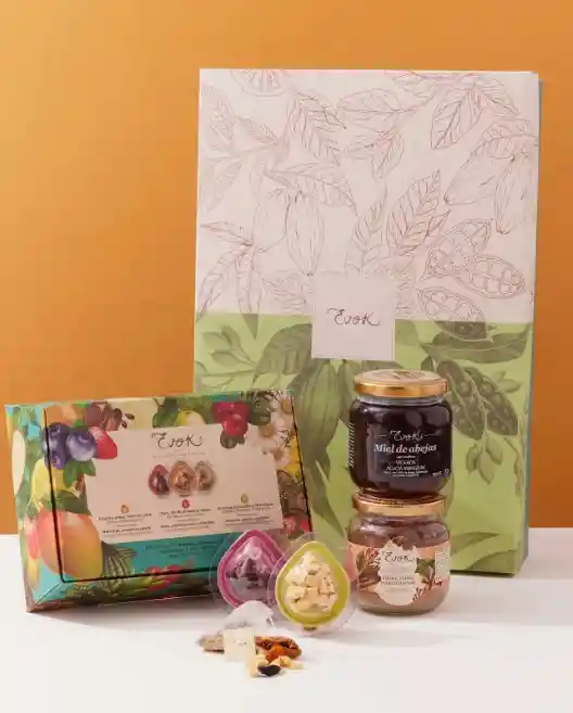 Set con 6 infusiones en cápsula, miel de abejas Vichada (280 g) y cacao especiado (80 g). Incluye caja de regalo de Evok.