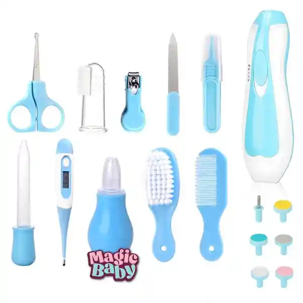 El Kit para Niño Azul de Higiene y Manicure para Bebé Recién Nacido es un conjunto completo y funcional diseñado para facilitar el cuidado diario del bebé. Este set incluye herramientas esenciales para la higiene, el cuidado personal y la salud del recién nacido, todo en un práctico estuche que permite mantener todo organizado y a mano. 🧰 Contenido del Kit Este kit incluye 11 piezas esenciales para el cuidado del bebé: Lima eléctrica: Permite limar suavemente las uñas del bebé sin riesgo de cortaduras. Cepillo para el cabello: Con cerdas suaves para evitar irritaciones en el cuero cabelludo. Peinilla: Ideal para peinar el cabello del bebé con delicadeza. Termómetro corporal: Para medir la temperatura del bebé de manera precisa y rápida. Cepillo siliconado de dedo: Diseñado para limpiar encías y primeros dientes de forma segura. Cortaúñas: Especialmente diseñado para bebés, con bordes redondeados para mayor seguridad. Aspirador nasal de pera: Para limpiar las vías respiratorias del bebé de manera efectiva. Tijeras con punta redonda: Para cortar las uñas del bebé sin riesgo de lesiones. Pinzas: Útiles para sujetar pequeños objetos o para la higiene del ombligo. Lima de uñas: Para suavizar los bordes de las uñas después de cortarlas. Gotero: Para administrar medicamentos o líquidos de forma precisa.