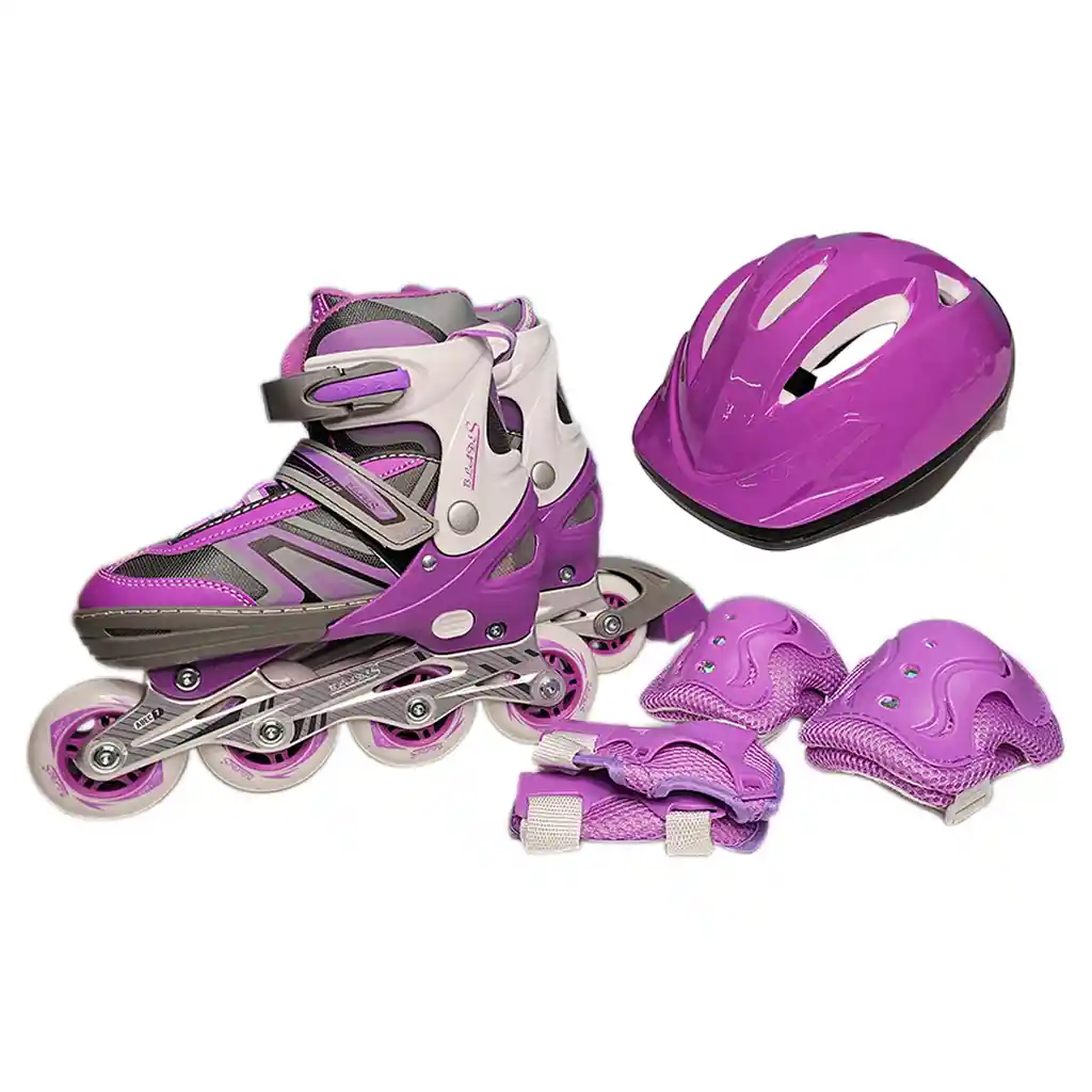 RECUERDA: Es recomendable utilizar 2 tallas mas del calzado normal del niño para que no le quede tan ajustado. Caracteristicas: - Chasis en aluminio, bota ergonómica, talla ajustable. - Rueda de Goma. - Tipo de Rodamiento. - Color Azul Accesorios: - Casco - Rodilleras - Coderas - Guantes Tallas: - XS: 27-30 - S:31-34 - M: 35-38. IMPORTANTE: - Los Patines se envían con la ruedas "Linea". - Solo incluye un Adaptador para la rueda - El cliente es quien hace la modificación en las ruedas.