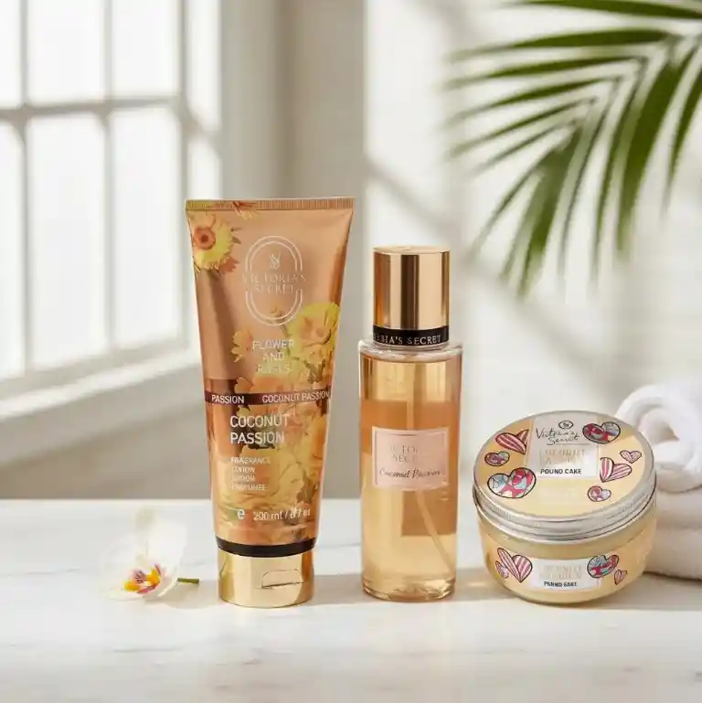KIT COCONUT PASSION Contiene: - Mantequilla 165ml - Crema 200ml - Splash 250ml Celebra la colección que te celebra. Para cada momento y cada faceta de ti, descubre aromas únicos que lo abarcan todo. PASIÓN POR EL COCO Coconut Passion de Victorias Secret es una fragancia de la familia olfativa Floral Frutal Gourmand para Mujeres.