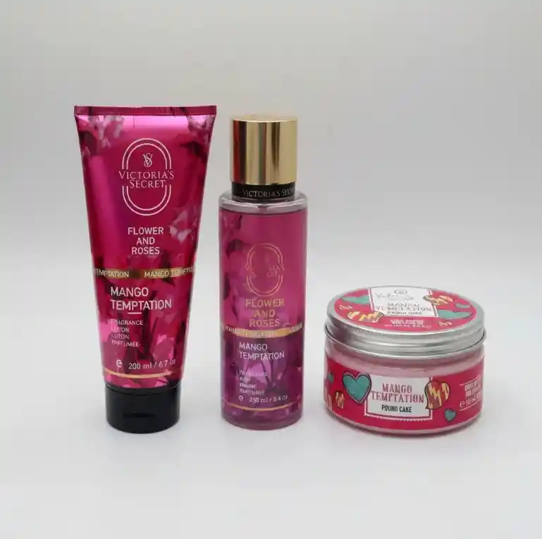 KIT MANGO TEMPTATION Contiene: - Mantequilla 165ml - Crema 200ml - Splash 250ml Notas Olfativas Mango Temptation de VS es una fragancia de la familia olfativa Floral Frutal para Mujeres.