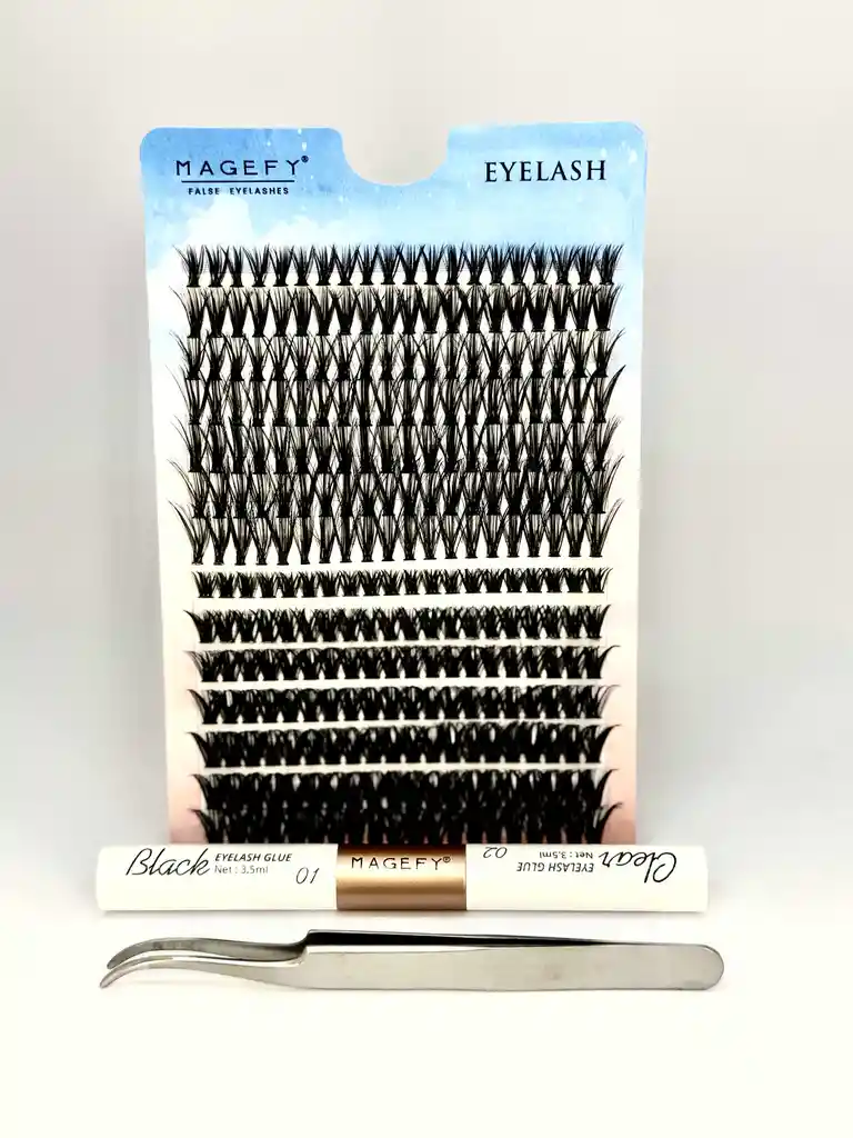 Kit pestañas punto a punto mixtas. Incluye pinza y pegante.