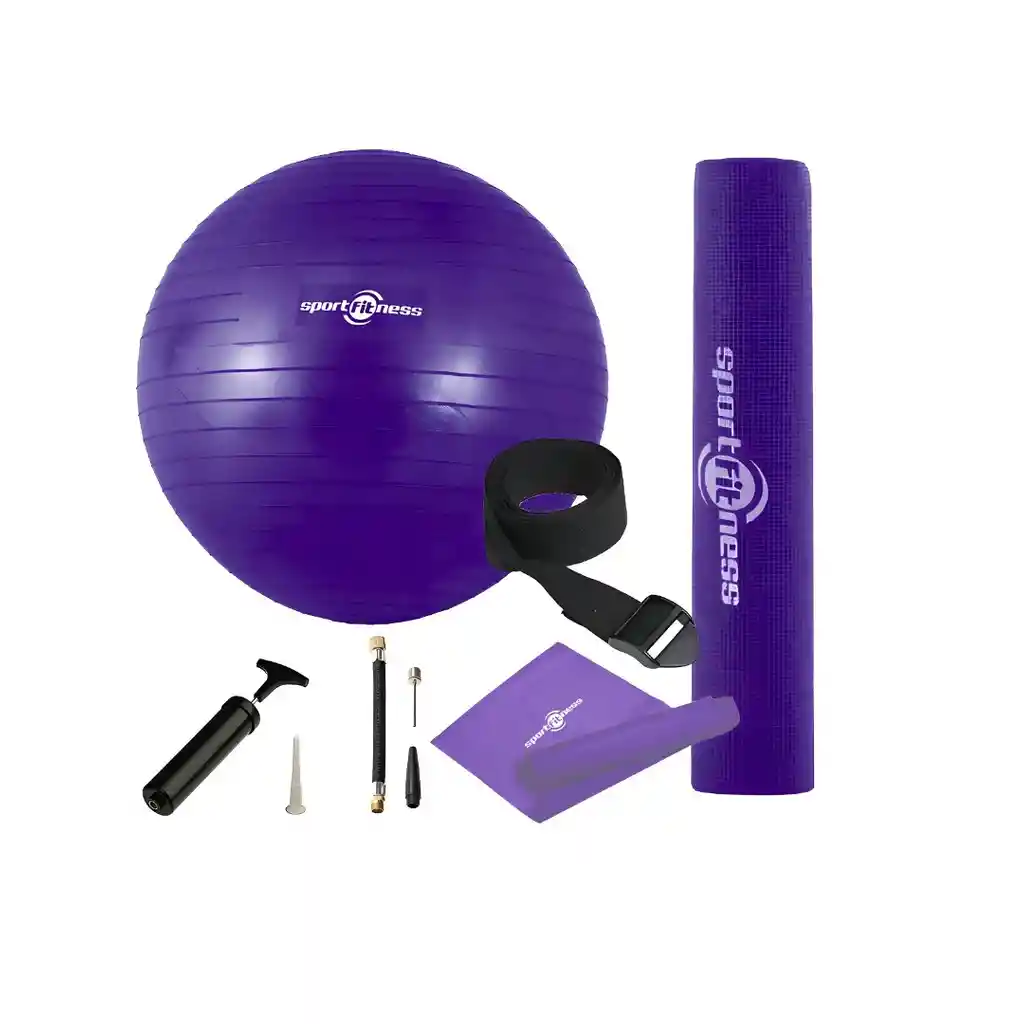 Kit para Fitness Morado Con una combinación versátil, este kit ofrece todo lo necesario para entrenar tu cuerpo, mejorar tu resistencia y alcanzar tus metas. Incluye: 1 Balón de Pilates de 55 cm. 1 mat de yoga. 1 theraband de tensión media. 1 reata para estiramientos 1 Inflador.