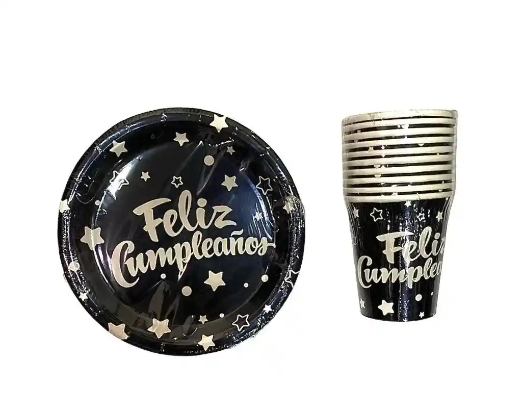 Kit de Platos y Vasos en cartón metalizado motivo Feliz Cumpleaños color negro. Paquete x 10 unidades