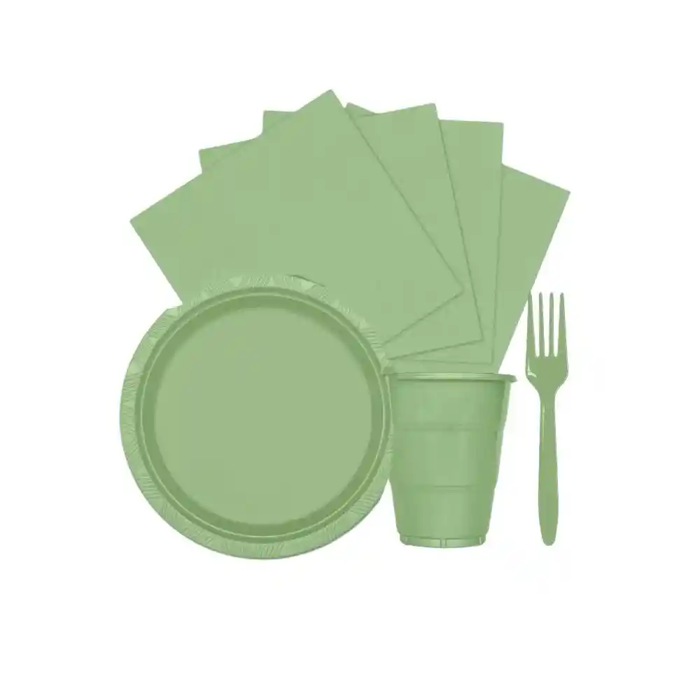 Juego de 10 Platos Grandes redondos ("9"), 10 vasos (7 onzas), 20 servilletas y 12 tenedores unicolor desechables del color. Set fiestas de cumpleaños unicolor, Kit desechables oxxo Color Verde eucalipto