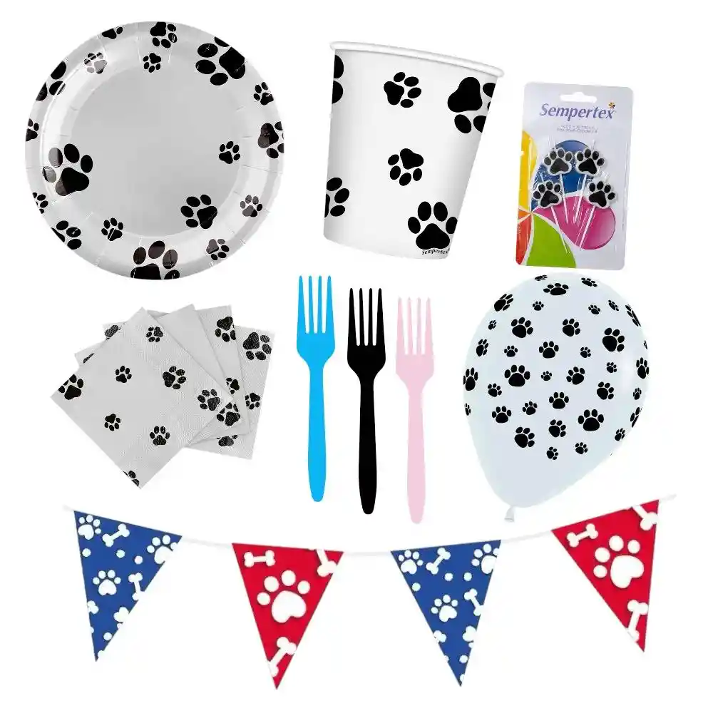 Juego de 8 platos redondos de 7 pulgadas , 8 vasos de 9oz, 16 servilltas , 12 tenedores y banderines ( color aleatorio a disponibilidad de la tienda) mas 12 globos de huellitas y un paquete de velas huellitas x4 Set fiestas de cumpleaños Decoracion de huellitas
