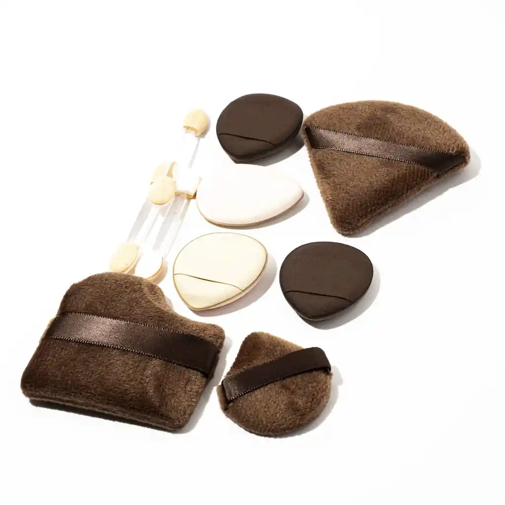 kit de 10 piezas está diseñado para brindarte precisión, comodidad y un acabado profesional, tanto en piel como en ojos 2 borlas grandes de terciopelo: 1 triangular y 1 cuadrada con borde, ideales para polvos y contorno 1 borla pequeña triangular de terciopelo: Perfecta para detalles y zonas pequeñas 4 mini blenders triangulares: Ideales para difuminar corrector y base con precisión 4 aplicadores dobles de esponja: Para aplicar sombras