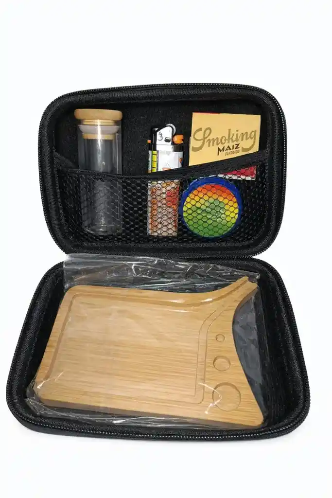 Este práctico kit portátil de armado es ideal para quienes buscan llevar todo lo necesario de forma organizada, discreta y segura. Viene en un estuche rígido con cierre, resistente y fácil de transportar, perfecto para el uso diario o viajes. En su interior incluye una bandeja de bambú con ranuras funcionales para un armado limpio y ordenado, además de compartimentos de malla que permiten guardar accesorios esenciales como frasco de vidrio, encendedor, grinder y papeles de liar. Todo queda bien sujeto y al alcance. Su diseño compacto y elegante combina funcionalidad y estilo, convirtiéndolo en una excelente opción tanto para uso personal como para regalo. Ideal para quienes valoran el orden, la calidad y la comodidad en un solo estuche.