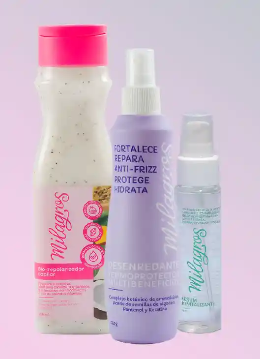 Productos: Tratamiento Biorepolarizador Desenredante Termoprotector Multibeneficios Serum Revitalizante Este kit incluye los productos más vendidos. Es ideal: para cabellos con alisados, keratina, sellados térmicos y cirugías capilares. Ayuda a repolarizar el cabello prolongando y protegiendo el alisado.