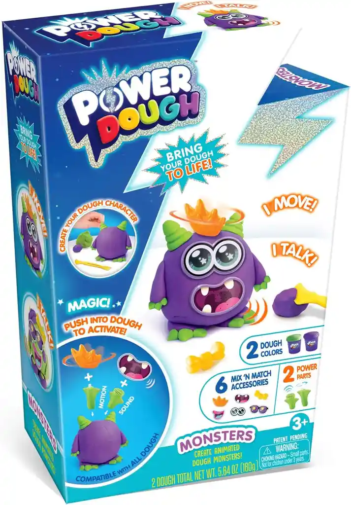 Kit Power Dough Masa Interactiva con Luz y Movimiento Incluye: - 6 accesorios intercambiables (ojos, bocas, cuernos y más) - 2 piezas de poder con baterías (movimiento, luz y/o sonido) - 2 masas de colores - Instrucciones de uso ¡Da vida a tu masa y crea personajes increíbles que se mueven, hablan y se iluminan! Con el Kit Power Dough, los niños pueden crear divertidos monstruos o unicornios animados usando masa especial conductora que activa los accesorios electrónicos. Solo debes moldear, presionar la masa en las piezas de poder… ¡y la magia comienza! Características: - La masa conduce la energía para activar movimiento, luz y sonido - Accesorios mix & match para infinitas combinaciones - Compatible con toda la línea Power Dough - Ideal para fomentar la creatividad y el juego imaginativo Información importante: Apto para niños de 3 años en adelante