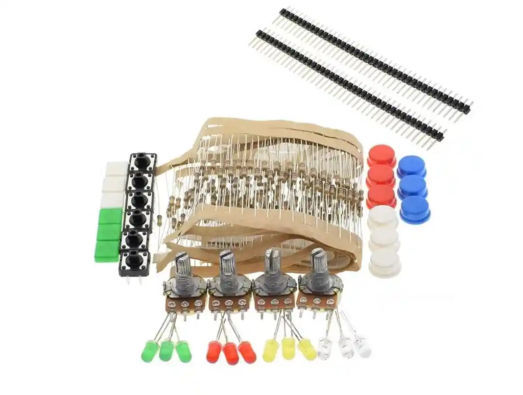 * KIT PRINCIPIANTE ARDUINO RESISTENCIAS PULSADORES LEDS Item Nombre Valor Cantidad 1 Resistencia carbon 100R 30 2 Resistencia carbon 1K 30 3 Resistencia carbon 4.7K 30 4 Resistencia carbon 10K 30 5 Resistencia carbon 47K 30 6 Resistencia carbon 100K 30 7 Resistencia carbon 1M 30 8 Potenciometro 10K 2 9 Potenciometro 100K 2 10 Led 5mm Verde 3 11 Led 5mm Rojo 3 12 Led 5mm Amarillo 3 13 Led 5mm Blanco 3 14 Pulsadores 6 15 Tapa pulsador Azul 3 16 Tapa pulsador Rojo 3 17 Tapa pulsador Blanco 3 18 Tapa pulsador cuadrado blanco 3 19 Tapa pulsador Verde Cuadrado 3 LA COMPRA INCLUYE: 1x KIT PRINCIPIANTE ARDUINO RESISTENCIAS PULSADORES LEDS GARANTiA DEFECTO DE FABRICA